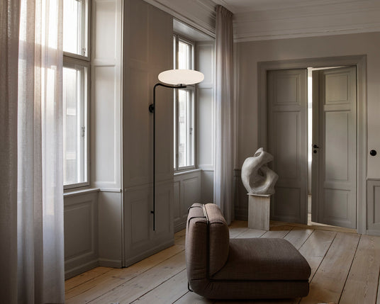 Model 1081 wirkt allein wunderschön, erzielt jedoch ein besonderes Ambiente, wenn zwei Lampen zusammen platziert werden und eine harmonische Komposition bilden. Der opale Schirm verbreitet ein warmes, diffuses Licht, das Ruhe und Atmosphäre in den Raum bringt. Die Lampe ist in zwei Höhen erhältlich, sodass Sie mühelos die Version wählen können, die am besten zu den Proportionen und dem Stil des Raumes passt.