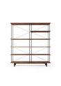Seiton wurde mit Blick auf den Alltag entwickelt. Die variierenden Felder der Regalbretter machen es einfach, Bücher, Keramik, Kisten und Technik zu inszenieren, ohne dass die Einrichtung schwer wirkt. Die klare Struktur hilft, den Überblick zu behalten, sodass Ordnung einfach gehalten werden kann. Die solide Konstruktion aus pulverbeschichtetem Stahl in Kombination mit Walnuss gewährleistet hohe Stabilität und lange Haltbarkeit. Gleichzeitig ist das Regal visuell leicht und wirkt selbst in kleineren Räumen nicht dominant. Die rechtsorientierte Komposition führt den Blick natürlich von oben nach unten und verleiht der Wand Charakter, ohne den Fokus von der restlichen Einrichtung zu stehlen.