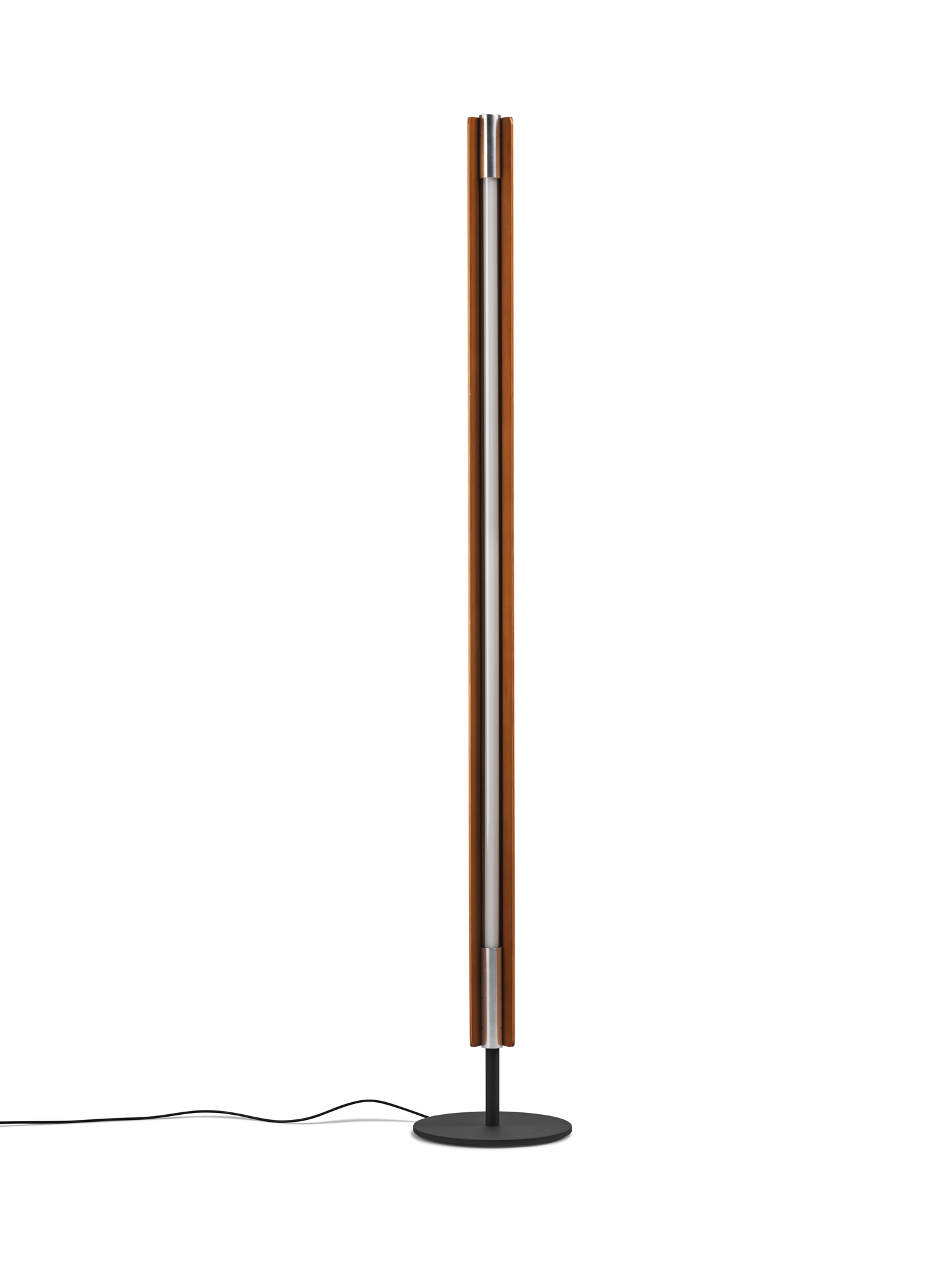 Aluminium & Eschenholz; verchromte Endstücke; Fuß in mattem schwarzen Metall.