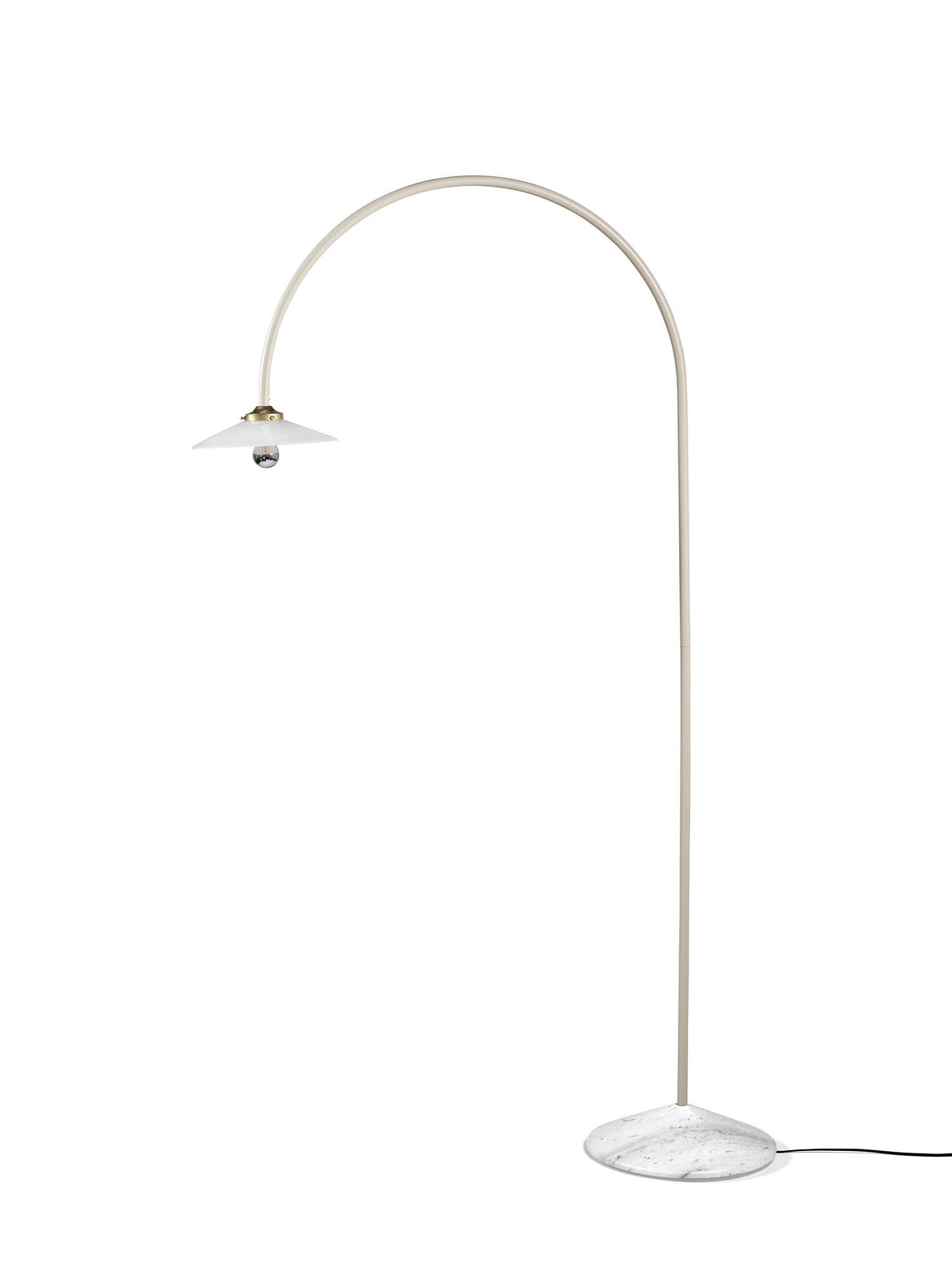 Die Lampe besteht aus einer schlanken, gebogenen Stahlkonstruktion in lackiertem Stahl, die sich elegant von einem soliden Fuß in Marmor erhebt. Die einfache Gestaltung lässt die Linien der Lampe im Raum hervortreten – ebenso sehr ein Kunstobjekt wie eine praktische Lichtquelle.